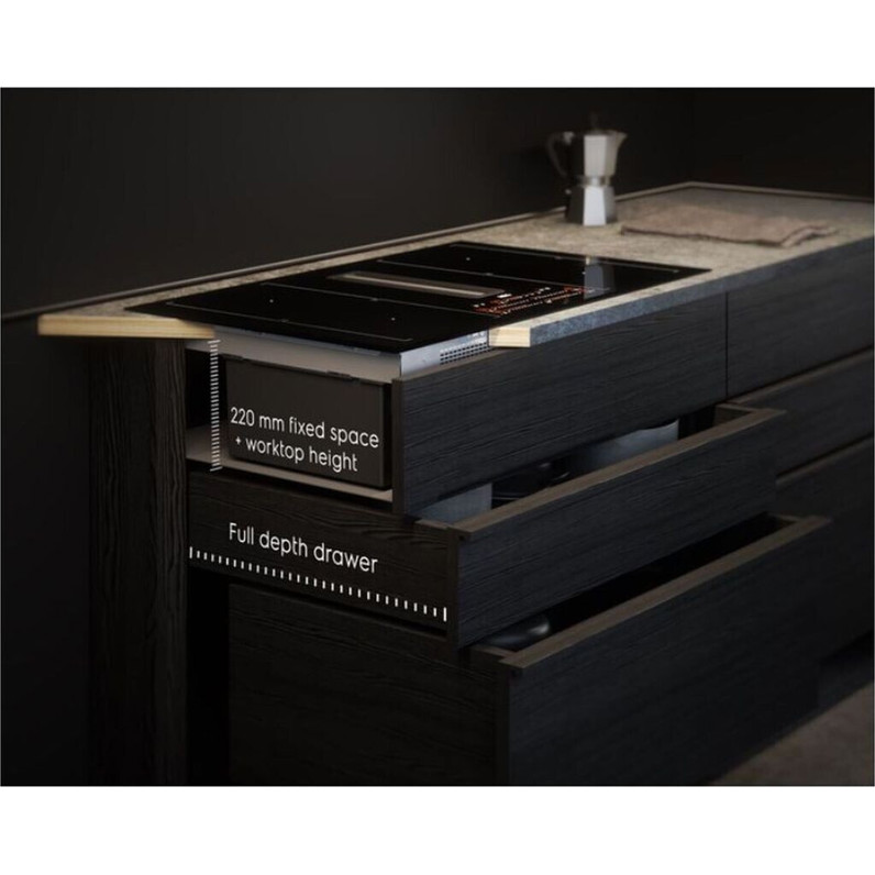 Neben der hohen Kochleistung bietet dieses Modell auch eine effiziente Luftreinigung im Umluftbetrieb. Das mittig liegende Kochfeldabzugssystem sorgt für frische Luft in Ihrer Küche, während Sie kochen. Die Geräuschkulisse von 64 dB bleibt dabei im angenehmen Bereich. Das Gerät lässt sich autark in jede moderne Küche integrieren und ist ein wahrer Blickfang.