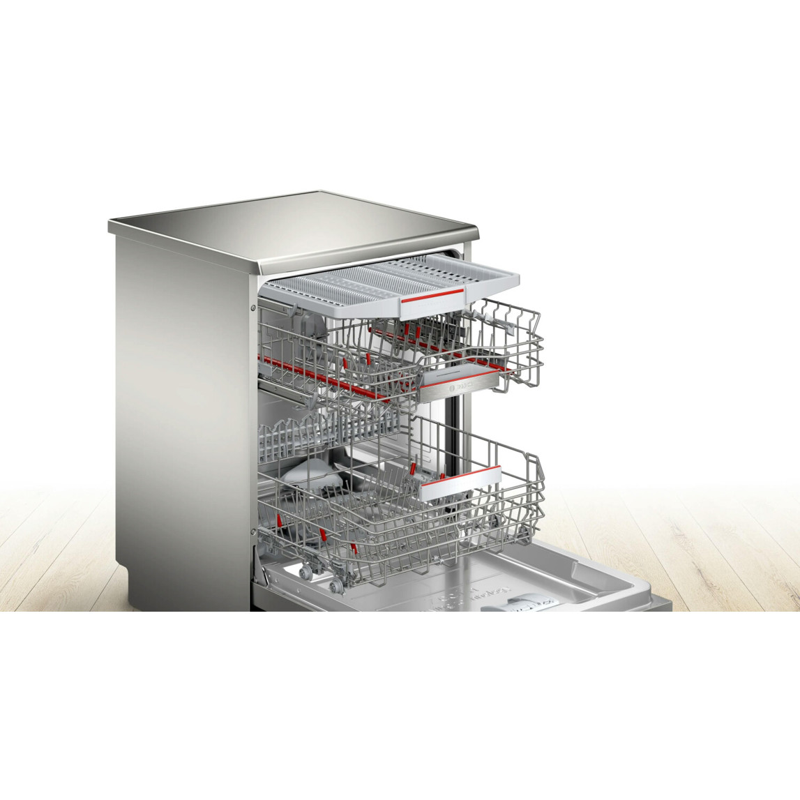 Der Bosch SMS6ZCI16E Standgeschirrspüler aus der erfolgreichen Bosch Serie 4 in edler Edelstahl-Optik überzeugt durch seine umfassende Ausstattung und innovative Technologie, die den Alltag erleichtert. Mit einer Breite von 60 cm fügt er sich nahtlos in jede moderne Küche ein und bietet Platz für bis zu 14 Maßgedecke.